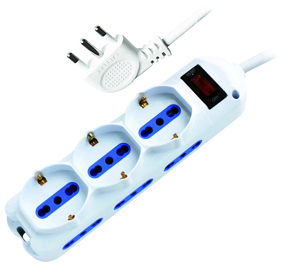 MULTIPRESA 3PR.SCHUKO/BIPASSO+6PR.BIVALENTI-SP.10A(2P+T) 90°+INTER. Protezione da Sovraccarico,2500W - 38.1030233P10